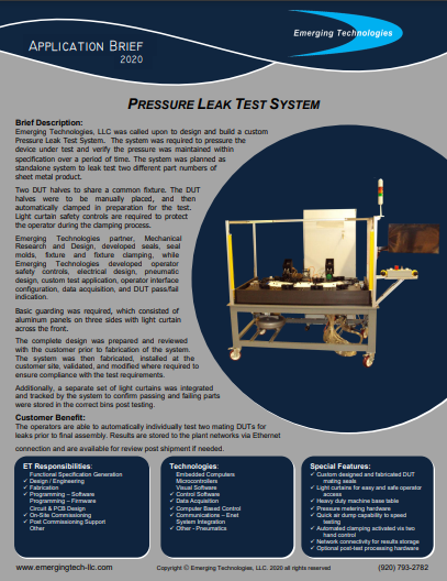 Emerging Technologies, LLC was called upon to design and build a custom Pressure Leak Test System. The system was required to pressure the device under test and verify the pressure was maintained within specification over a period of time. The system was planned as standalone system to leak test two different part numbers of sheet metal product.